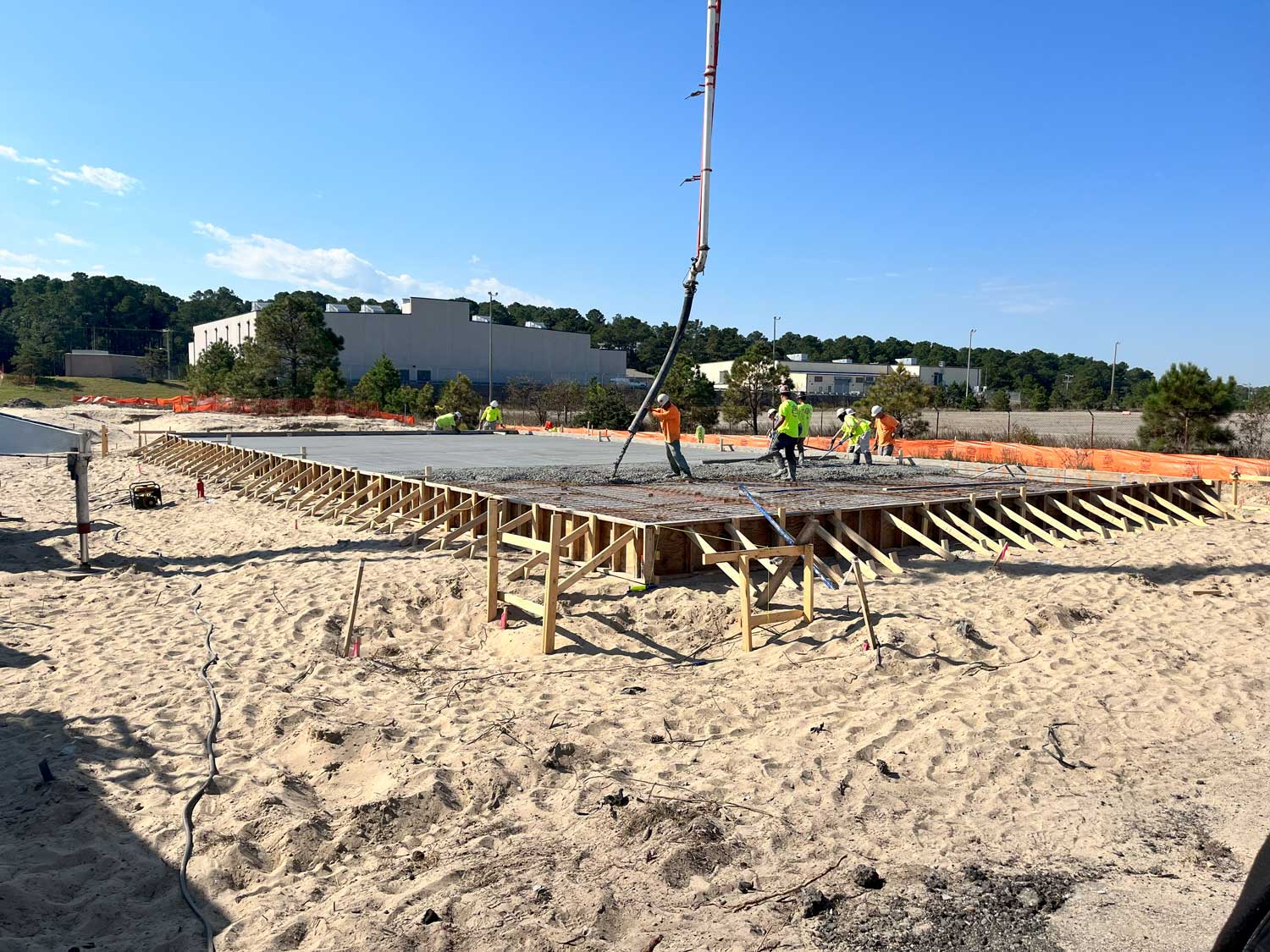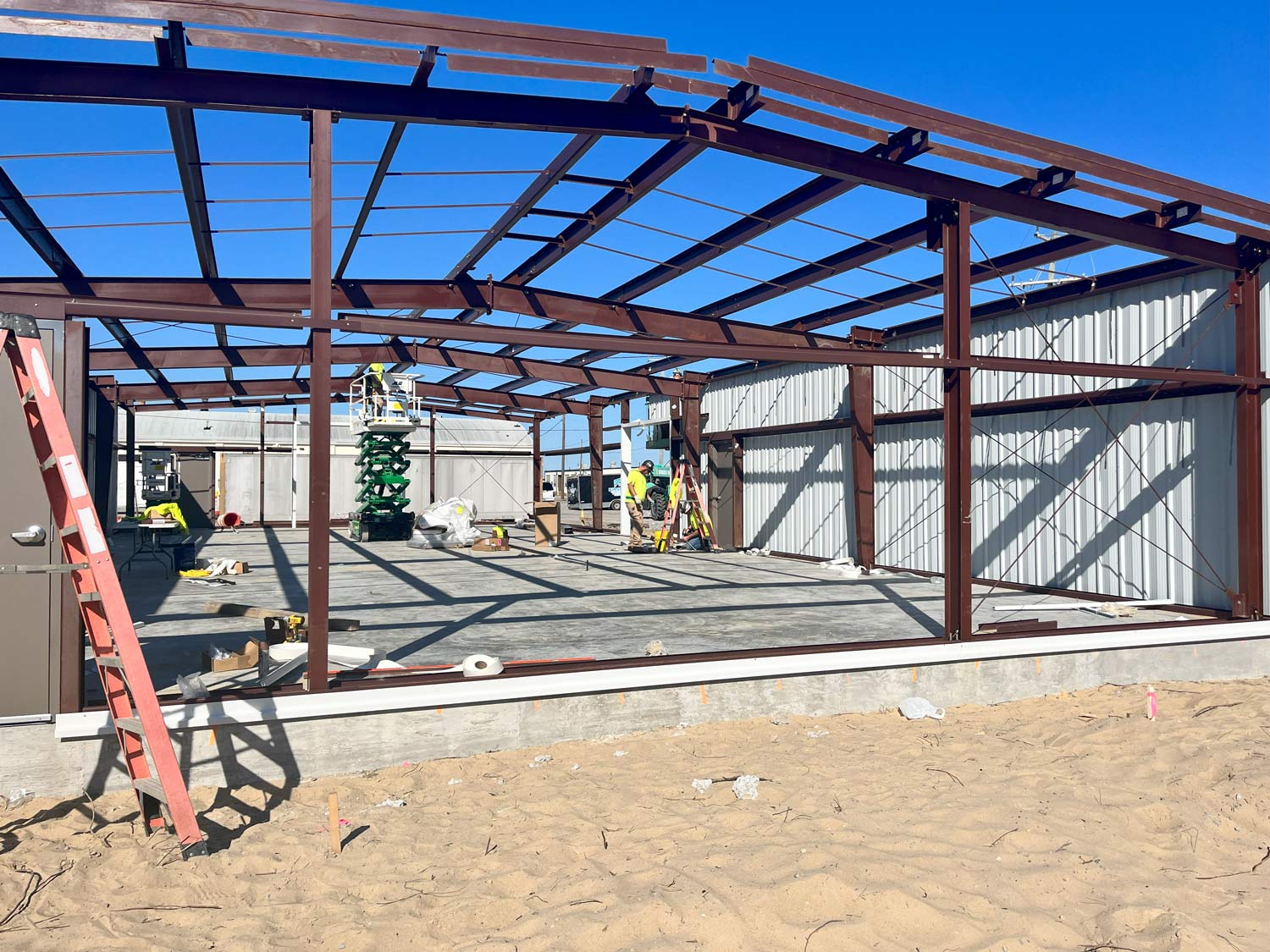 The project site was comprised of sand dunes and small trees, requiring our team to clear just under an acre to accommodate the site improvements. Two concrete stoops and a concrete mechanical equipment pad were provided to support the PEMB. The new building measures 40 feet wide by 80 feet long, with a gross area of 3,200 square feet and three hollow metal doors. Construction included a two single-zone split-heat-pump HVAC system.
