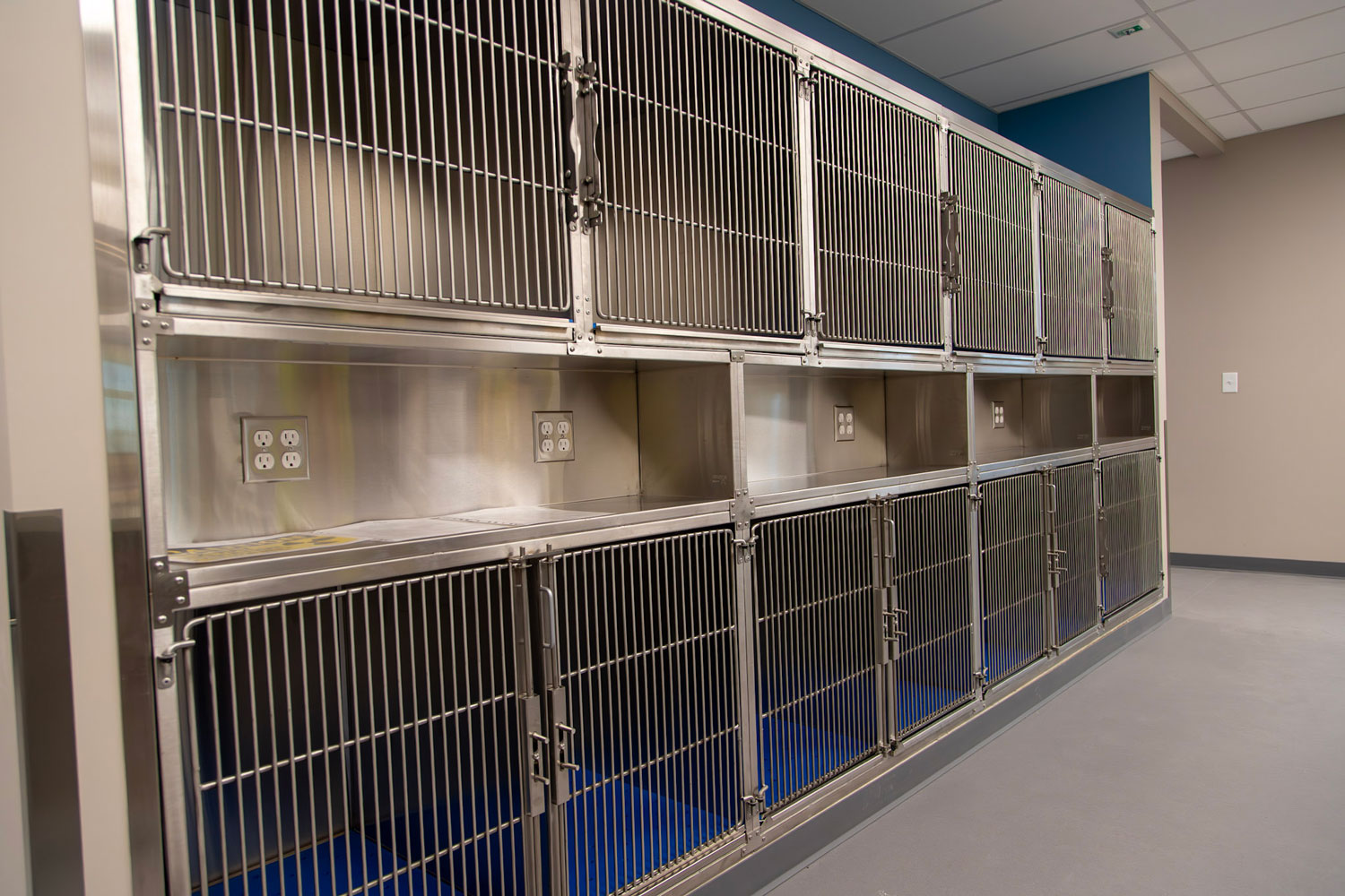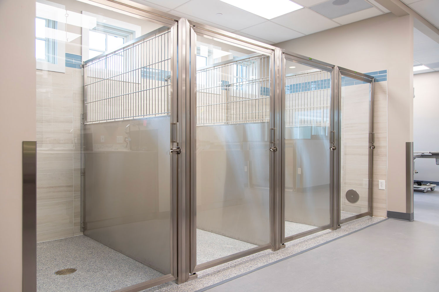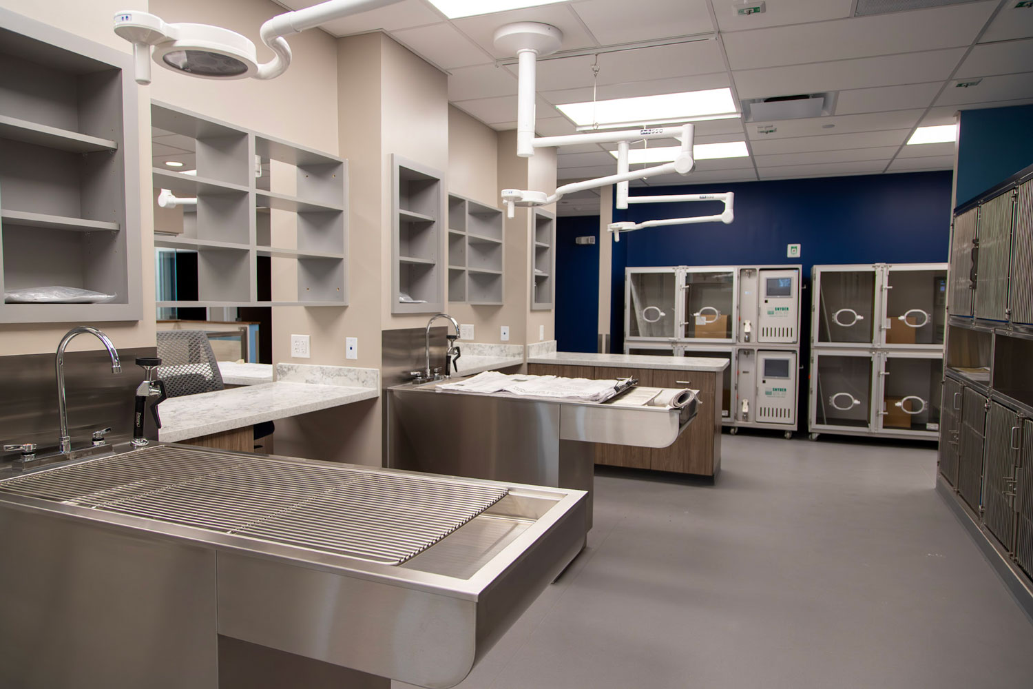 Specialty construction elements were integrated to meet the complex operational needs of the facility. These include sound-isolating wall assemblies, waterproof wall systems, oxygen supply infrastructure, and coordination for integrated veterinary equipment. A lead-lined medical waste storage room was also constructed to ensure safe handling of hazardous materials in compliance with health and safety regulations.