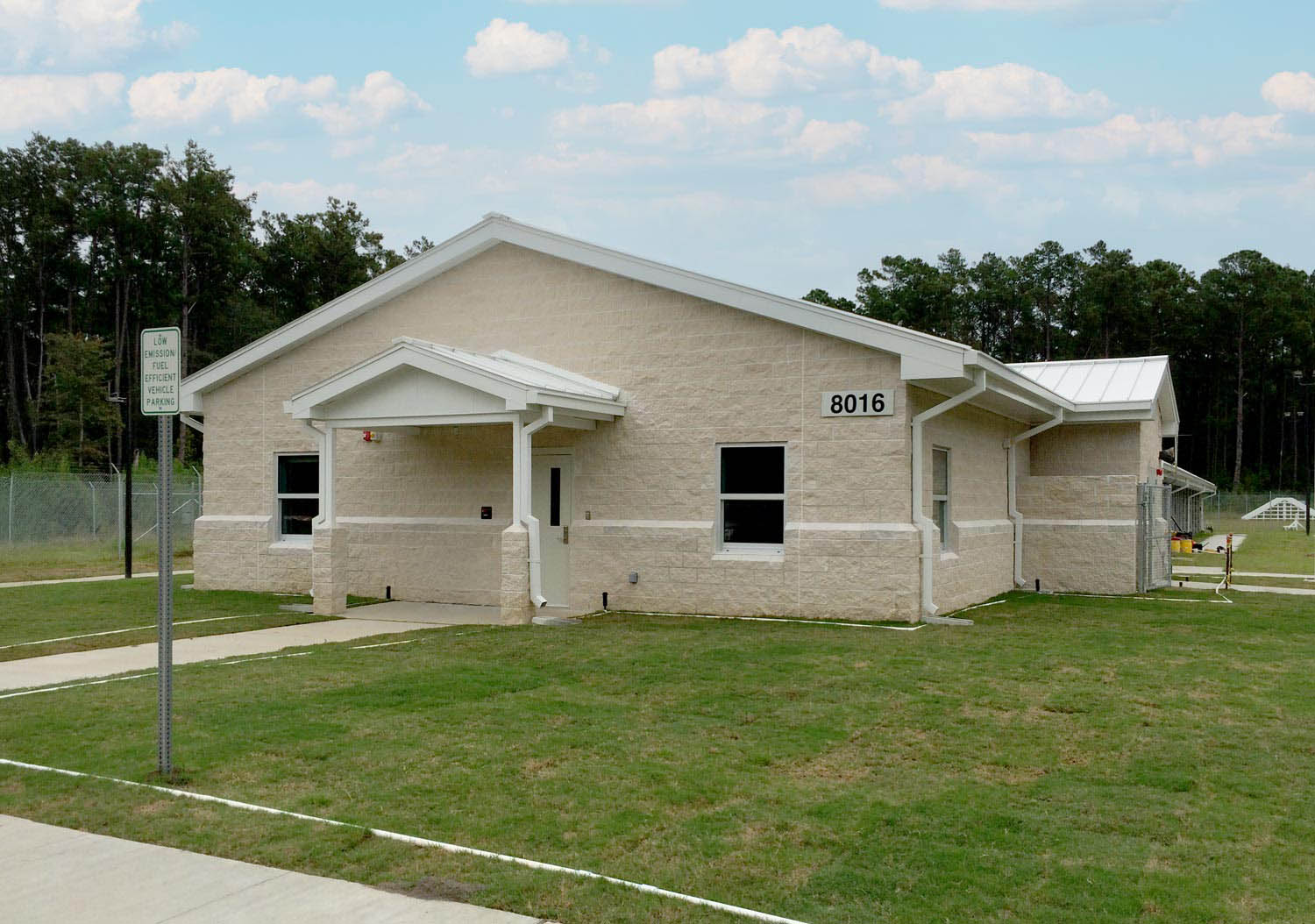 The facility includes eight kennel bays, along with purpose-built support spaces for food preparation, storage, canine bathing, and mechanical/electrical systems. Constructed on a durable concrete slab with load-bearing CMU walls and light-gauge metal trusses, the new kennel was engineered for long-term performance in a secure, mission-critical setting.